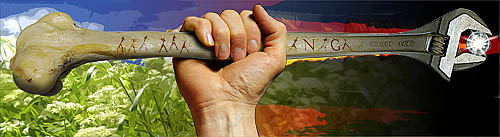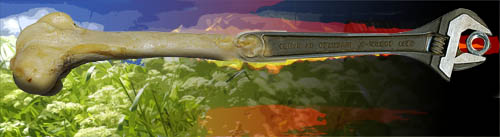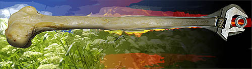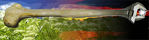 Lehtijutun aiheena oli evoluutio. Kuvassa se on pelkistetty ihmisen evoluutioksi. Joskus ihminen oppi ottamaan työkalun käteensä ja muokkaamaan siiitä aseen tai veitsen. Kulttuuri kehittyi luolapiirroksista kirjoitukseksi, luu metalliteollisuudeksi, kohti valoa hohtavaa mutteria. Samaan aikaan maisema takana mustenee.