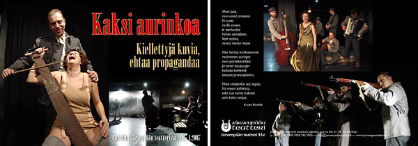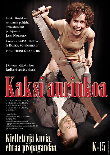Kaksi aurinkoa. Kauko Röyhkän romaanista näytelmän dramatisoi ja ohjasi Jari Nissinen Järvenpään teatterissa 2007. Esityksen juliste (kuvassa Pauliina Naala ja Juha Palkeinen) sekä käsiohjelman kansi ja takasivu.