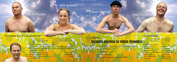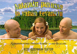 Aatamin puvussa ja vähän Eevankin Krapin kesäteatterissa Tuusulan rantatiellä kesällä 2007. Julisteessa Panu Vauhkonen, Pihla Penttinen ja Ari-Kyösti Seppo. Alla pari sivua käsiohjelmasta. Kuvissa edellisten lisäksi Antero Nieminen ja ohjaaja Kari Paukkunen.