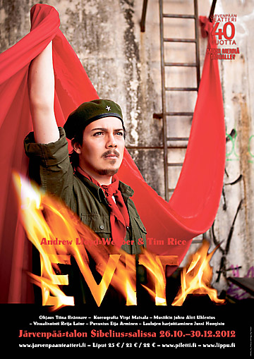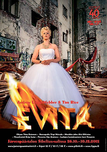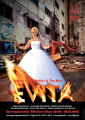 Evita. Musikaali Järvenpään teatterissa .Graafinen suunnittelu. Julisteessa Lotta Häkkinen, Kalle Tahkolahti ja Anna Leikas. Valokuvat Pauli Haanpää.