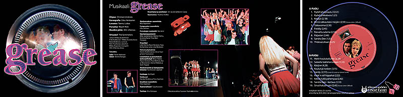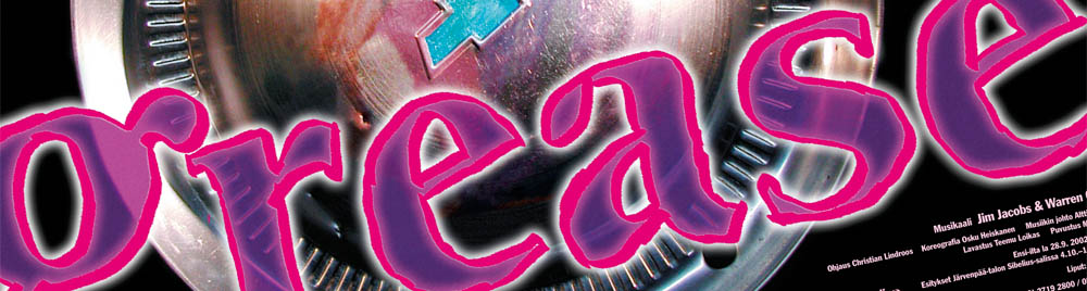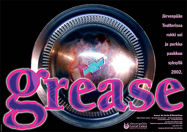 Grease Järvenpään teatterissa 2002. Yllä juliste, alla sivuja käsiohjelmasta. Ennakkoon tulevasta esityksessä ei paljoa tiedetty, mutta se oli päätetty, että lavasteisiin kuuluisi aito amerikanrauta – siksipä materiaalien visuaaliseksi lähtökohdaksi otettiin Chevroletin pölykapseli ja yksilöllisesti tehty esityksen logo.