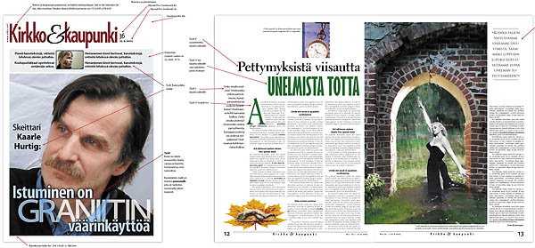 Kirkko ja kaupunki -lehden ulkoasun suunnittelu 1998 ja 2003. Kuvassa on näytesivuja lehden graafisesta ohjeesta 2003 (kuvat ja tekstit ovat vain suunnitelman esimerkkiaineistoa). Ulkoasua käytettiin vuoteen 2009 saakka.