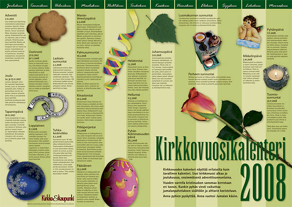 Helsingin seurakuntien ja Kirkko ja kaupunki -lehden kirkkovuosikalenteri 2008, julisteen graafinen suunnittelu.
