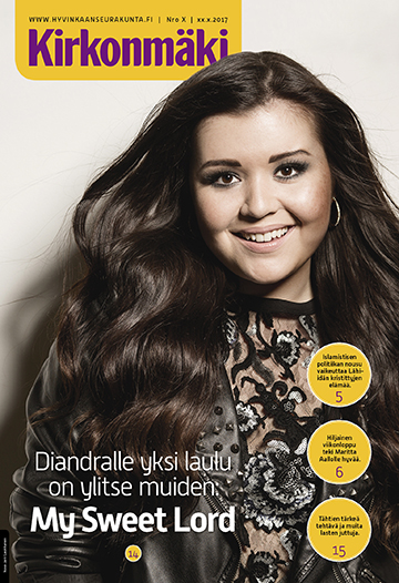 Kirkonmäki. Hyvinkään seurakunnan lehden ulkoasu-uudistus 2016. Kuvassa on suunnitelman mallilehden kansi.