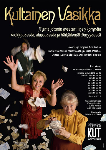 Maria Jotunin Kultainen vasikka Keski-Uudenmaan teatterissa 4.11.–28.11.2010. Graafinen suunnittelu ja valokuvaus. Julisteessa Maija-Liisa Peuhu, Anna-Leena Sipilä ja Ari-Kyösti Seppo.