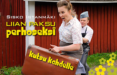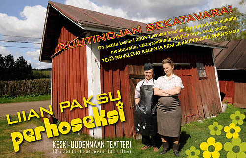 Sisko Istanmäen Liian paksu perhoseksi Keski-Uudenmaan teatterissa, Krapin kesäteatterissa kesällä 2008. Pääosissa olivat Noora Raikamo ja Valtteri Tuominen (kuvassa). Näytelmä sijoittuu 1970-luvulle ja sen oli tarkoitus näkyä myös graafisessa tyylissä. Yllä flaieri sekä kutsu ensi-iltaan. Ensimmäisiä markkinointikuvia varten etsittiin lähistöltä näytelmän henkeen sopiva kuvauspaikka.