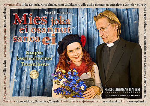 Mies joka ei osannut sanoa ei Keski-Uudenmaan teatterissa kesällä 2009. Ohjaus Milko Lehto. Kuvassa on juliste, jonka valokuvan on ottanut Hans von Schantz, näyttelijät ovat Kirsi Ylijoki ja Ilkka Koivula. Esityksen käsiohjelma on täällä (pdf 1,8 mb), sen valokuvat ovat Timo Saarisen kuvaamia.