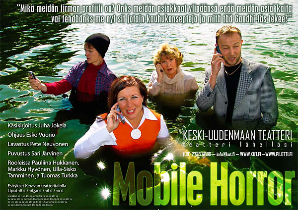 Mobile Horror, Juha Jokelan kirjoittama näytelmä Keski-Uudenmaan teatterissa 2007. Julisteen kuvassa Tuomas Turkka, Pauliina Hukkanen, Ulla-Sisko Tamminen ja Markku Hyvönen. Heidät kuvattiin syksyllä hyisen kylmässä Tuusulanjärvessä.