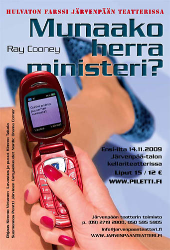Ray Cooneyn Munaako herra ministeri? Järvenpään teatterissa 2009–2010. Graafinen suunnittelu. Kuvassa juliste.