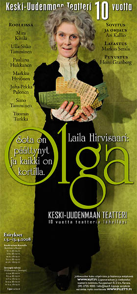 Laila Hirvisaaren Olga Keski-Uudenmaan teatterissa 2008. Julisteen kuvassa pääosaa esittänyt Mira Kivilä.
