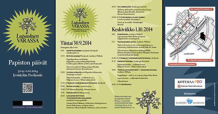 Papiston päivät. Graafinen suunnittelu 2012 ja 2014. Yllä päivien 2014 logo. Alla osia käsiohjelmasta. Kuva Hannu Hyrske.