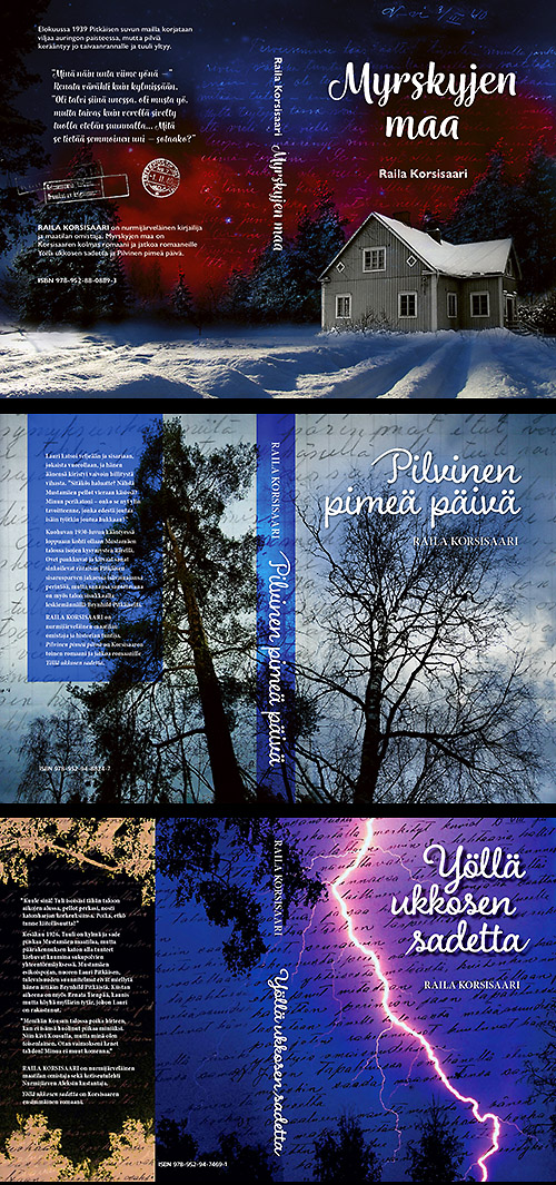 Raila Korsisaaren romaanisarjan kolmen osan kansien suunnittelu ja sivutaitto 2023–2025.