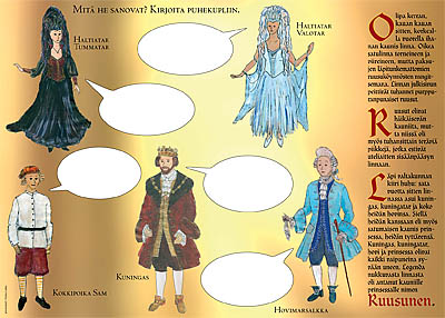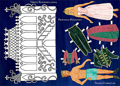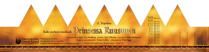 Sama kruunu painettiin vielä käsiohjelmaan irtileikkausohjeiden kera. Kantena oli julisteen kuva A4-koossa. Sisäänpäin taitettujen siivekkeiden välistä näkyi lapsille tarkoitettu puuhapahvi, jonka kuvat piirsi lavastaja ja pukusuunnittelija Teemu Loikas.