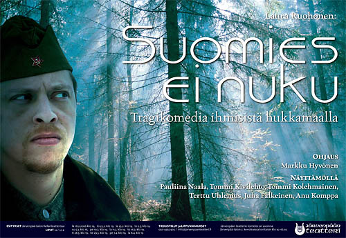 Suomies ei nuku Järvenpään teatterissa 2006. Graafinen suunnittelu. Julisteessa Juha Palkeinen, joka on kuvattu talvella luonnonvalossa ja yhdistetty omista arkistoista löytyneeseen sumuisena kesäaamuna kuvattuun metsäkuvaan.