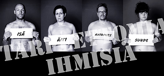 Reko Lundánin Tarpeettomia ihmisiä Järvenpään teatterissa 2010–2011. Graafinen suunnittelu, valokuvaus ja nettisivut. Ohjaus Markku Hyvönen. Kuvassa Tommi Kolehmainen, Pauliina Naala, Juha Palkeinen ja Anu Uhlenius. Suunnittelemani esityksen nettisivut ovat täällä. Olen myös toteuttanut nettisivujen äänen.