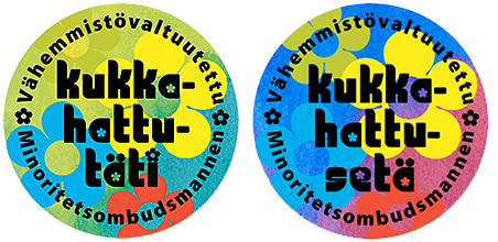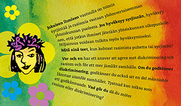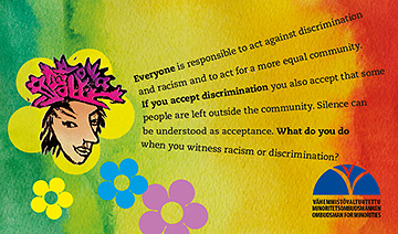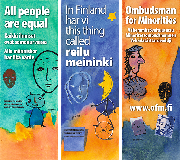Vähemmistövaltuutetun festivaali- ja messumateriaaleja. Graafinen suunnittelu. Kuvitus Hannu Hyrske. Yllä flaierikortti, alla roll-up ja rintamerkki.