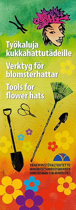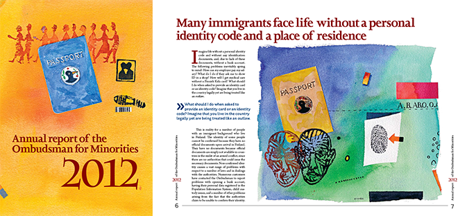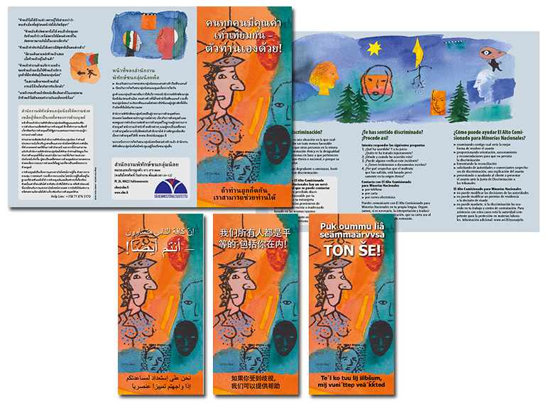 Vähemmistövaltuutetun esite, joka tehtiin yhteensä 19 eri kielellä, kääntäjien kanssa yhteistyössä myös useilla ei-latinalaisilla kirjaimilla kirjoitettavilla kielillä, kuten kiina, thai, arabia ja kurdi. Kuvitus Hannu Hyrske.