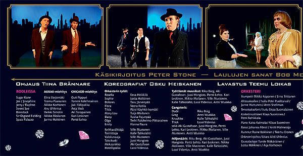 Logon alla oleva tekstityyppiä ehdotti lavastaja. Hän halusi kirjoittaa lavastukseen kuuluvan miamilaisen hotellin nimen ajan henkeen sopivalla Broadway-fontilla. Niinpä samaa käytetään graafisessakin materiaalissa. Kolmanneksi fontiksi valitsin kulmikkaan, elokuvajulistemaiseen tyyliin sopivan kirjainleikkauksen.