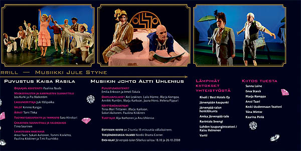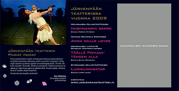 Teatterin periaatteisiin kuuluu, että näyttelijöitä lukuunottamatta keskeisimmät tekijät, kuten ohjaaja, lavastaja, puvustaja ja muusikot ovat ammattilaisia. Usein myös graafikko — sitä osaa minä olen saanut hoitaa useassa produktiossa.